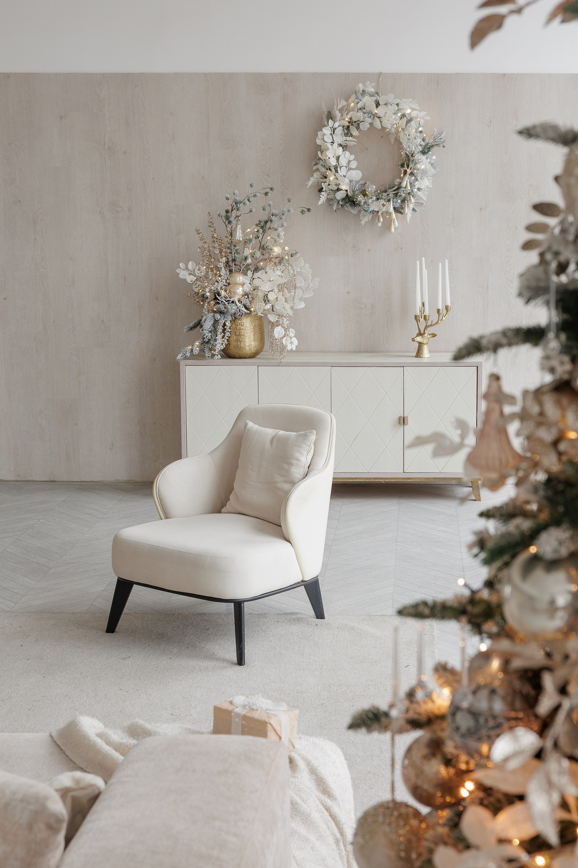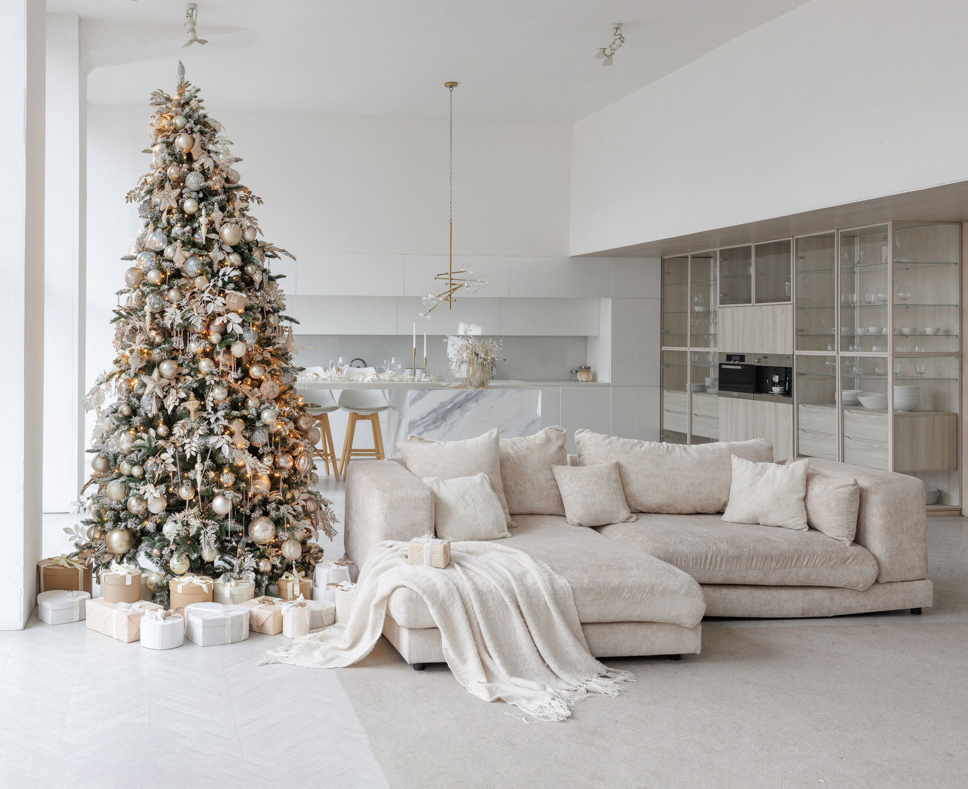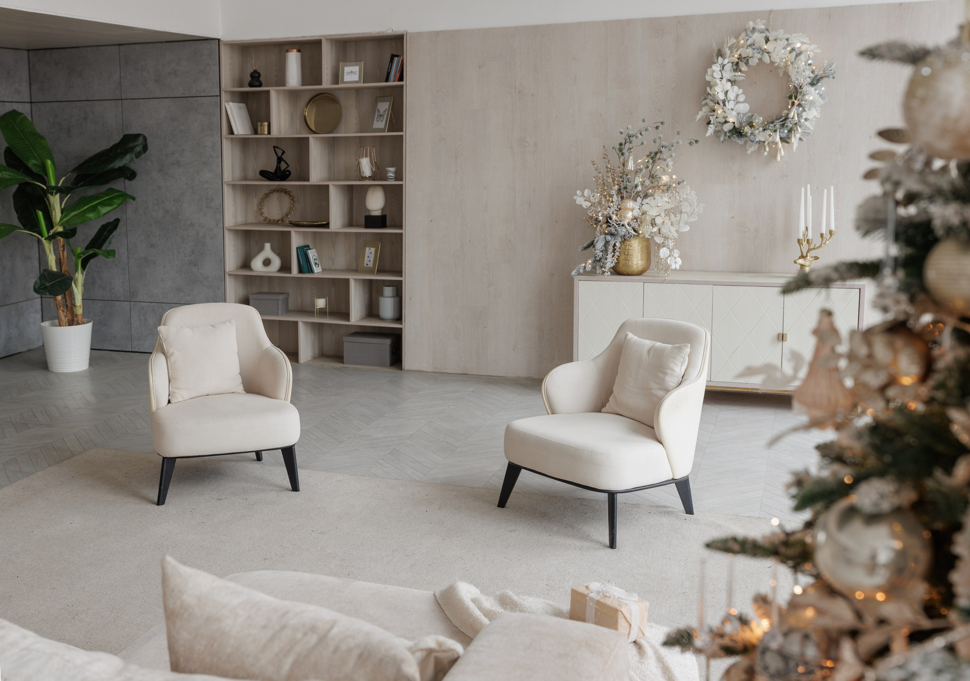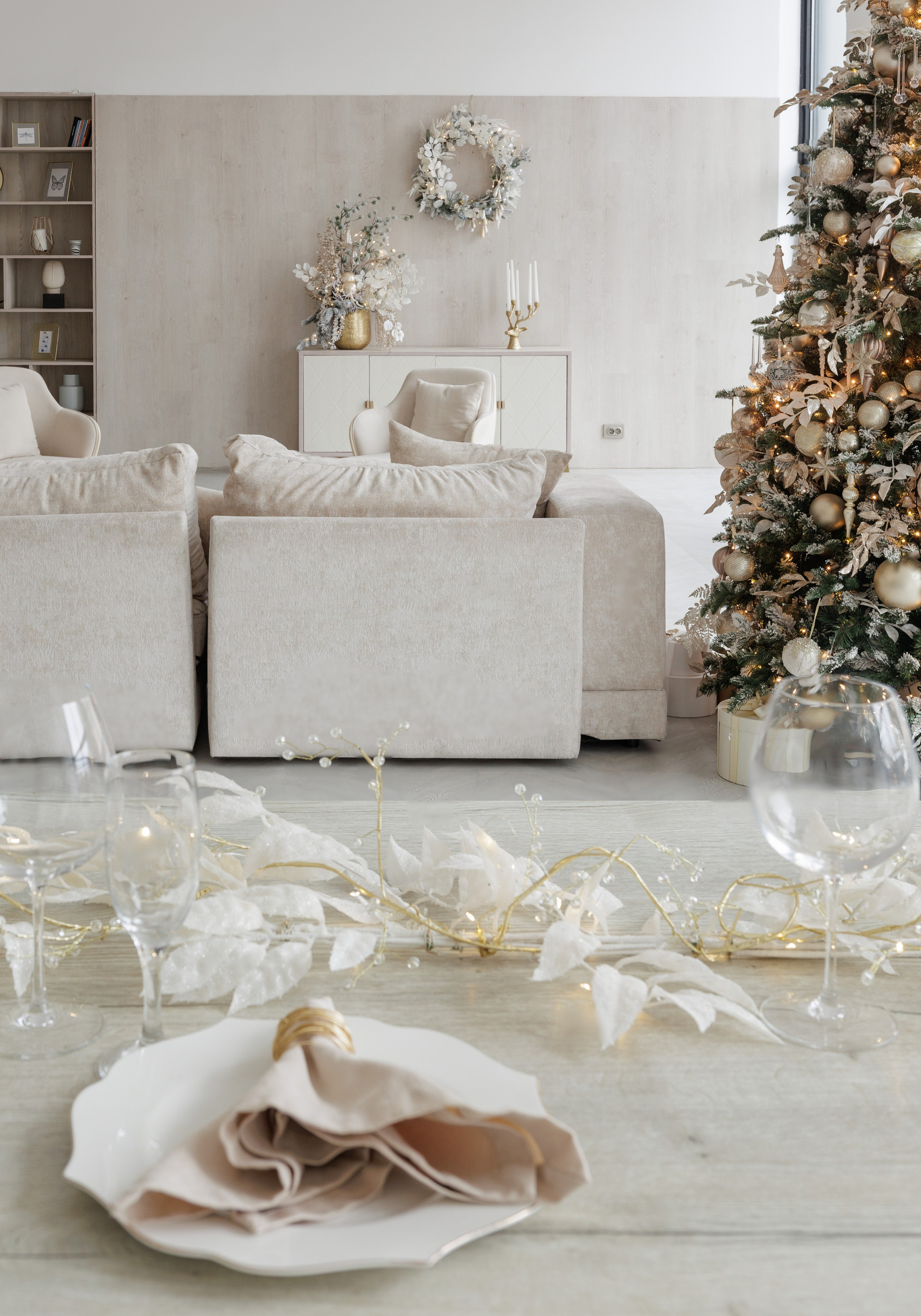 В новогодний сезон зал оформлен в светлых тонах с золотыми акцентами, которые подчеркивают изысканность интерьерного пространства зала Мия.