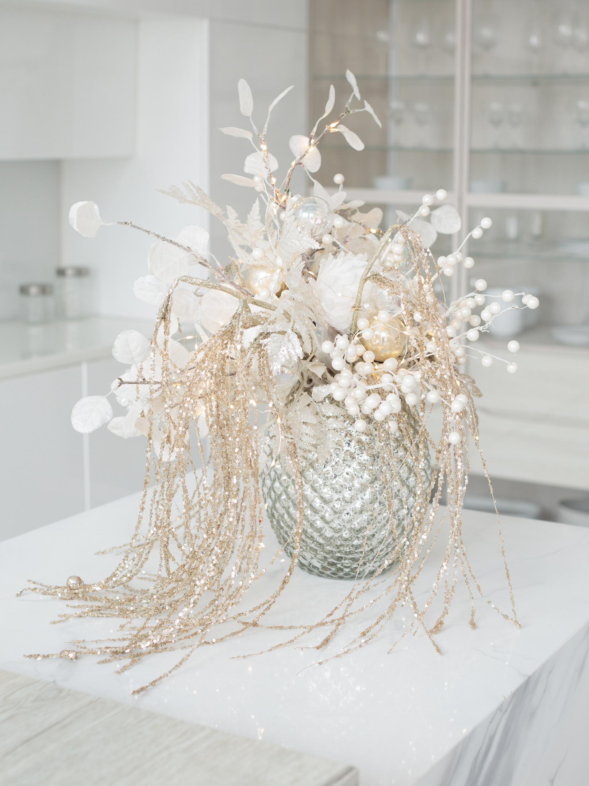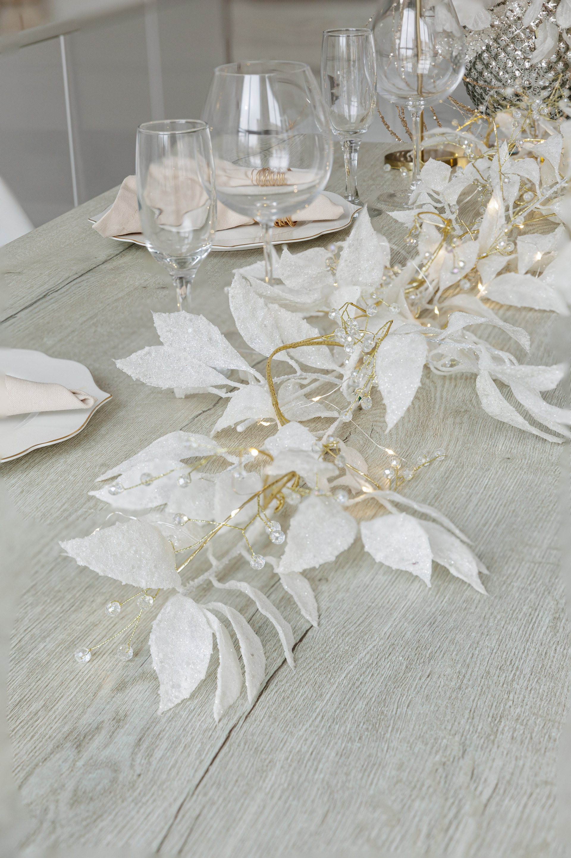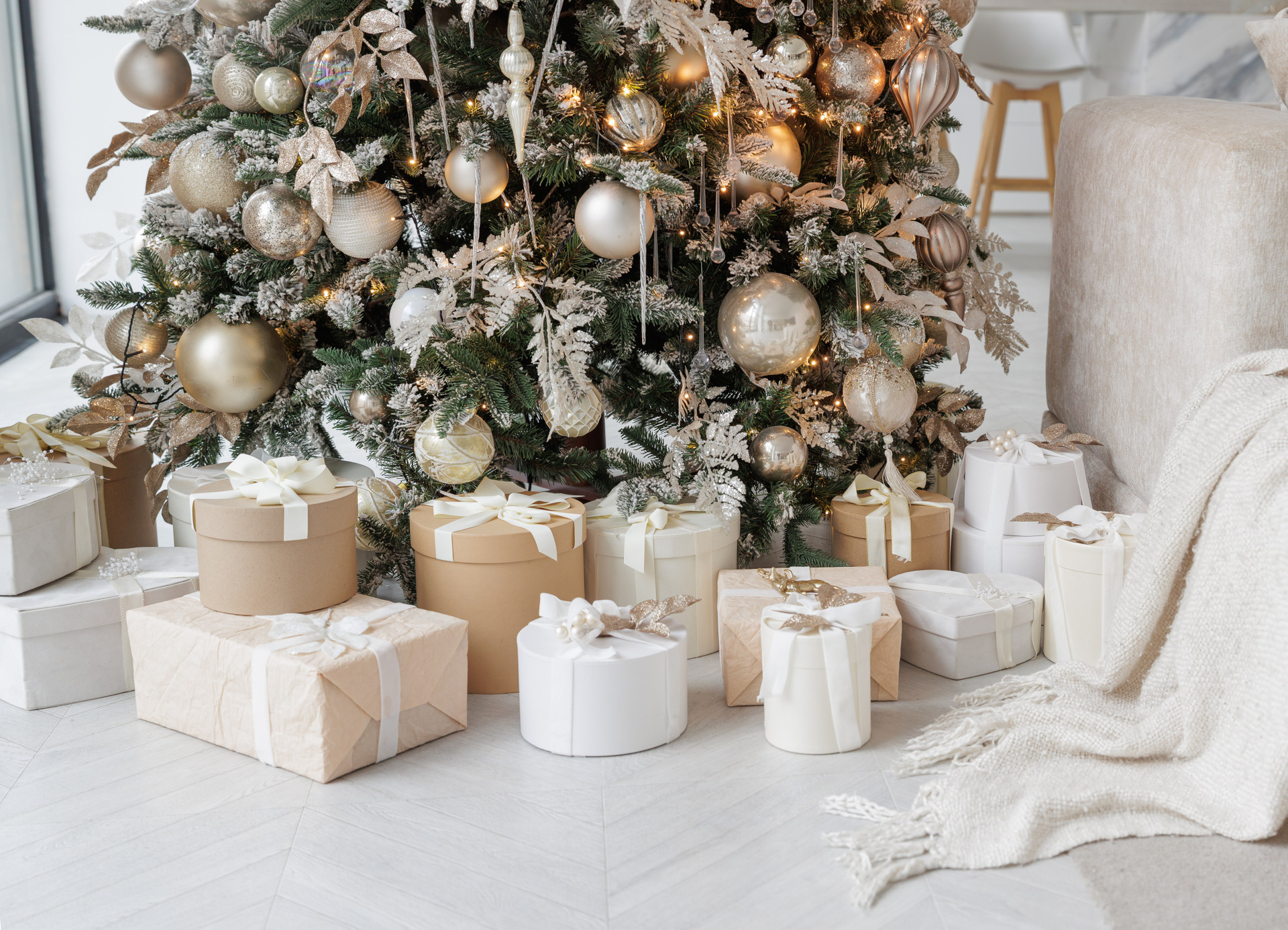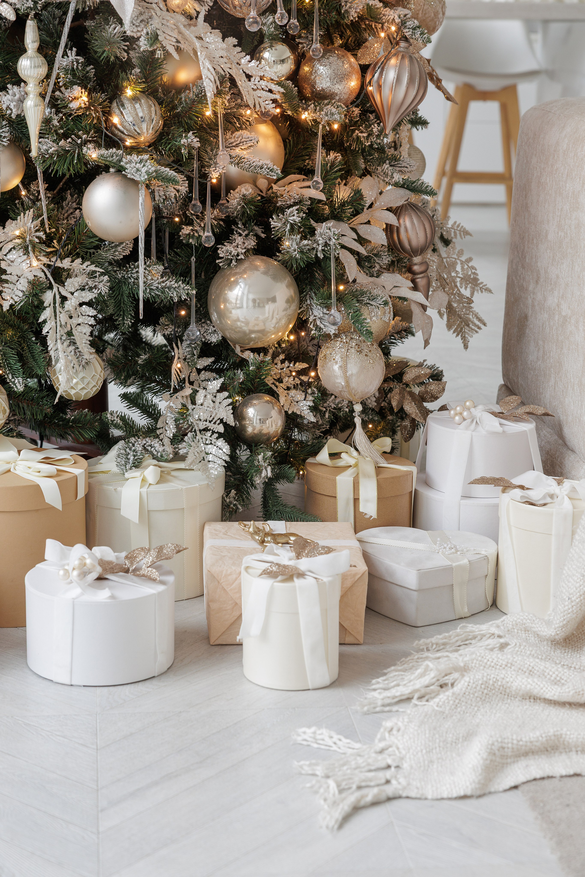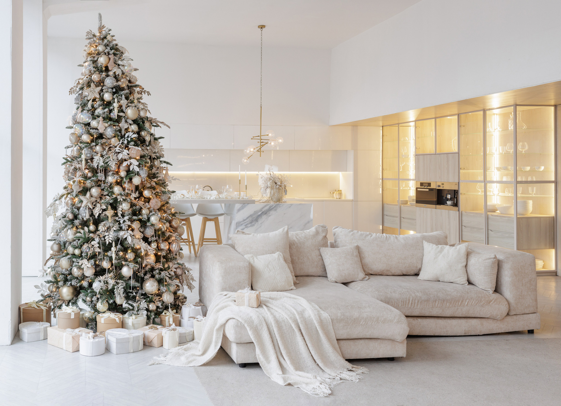 В новогодний сезон зал оформлен в светлых тонах с золотыми акцентами, которые подчеркивают изысканность интерьерного пространства зала Мия.